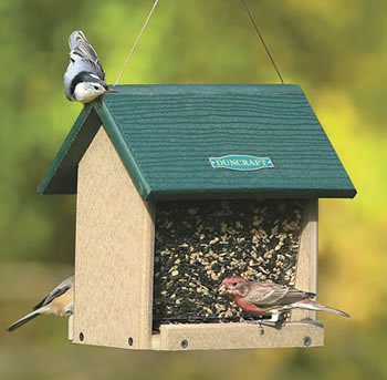 Hoppers are the mainstay of bird feeding! Many people began feeding birds with a hopper feeder. Hopper feeders attract different varieties of birds and can be used with most any seed. Ours is made with impervious, Eco-friendly recycled plastic—non-porous and hygienic. Side-panels open at the bottom to dispense the seed onto the tray. The clear plastic lets you monitor the seed level. Green and tan, Small Hopper holds 2-1/2 lbs. and is 8 x 7 x 10 inches. Read more customer reviews ...